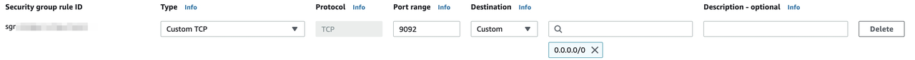 - Set Port range. You can find the port range in the Public endpoint in the Bootstrap servers section from the MSK cluster's View client information page. The port range can be 9092 or 9096 according to MSK cluster's authentication.