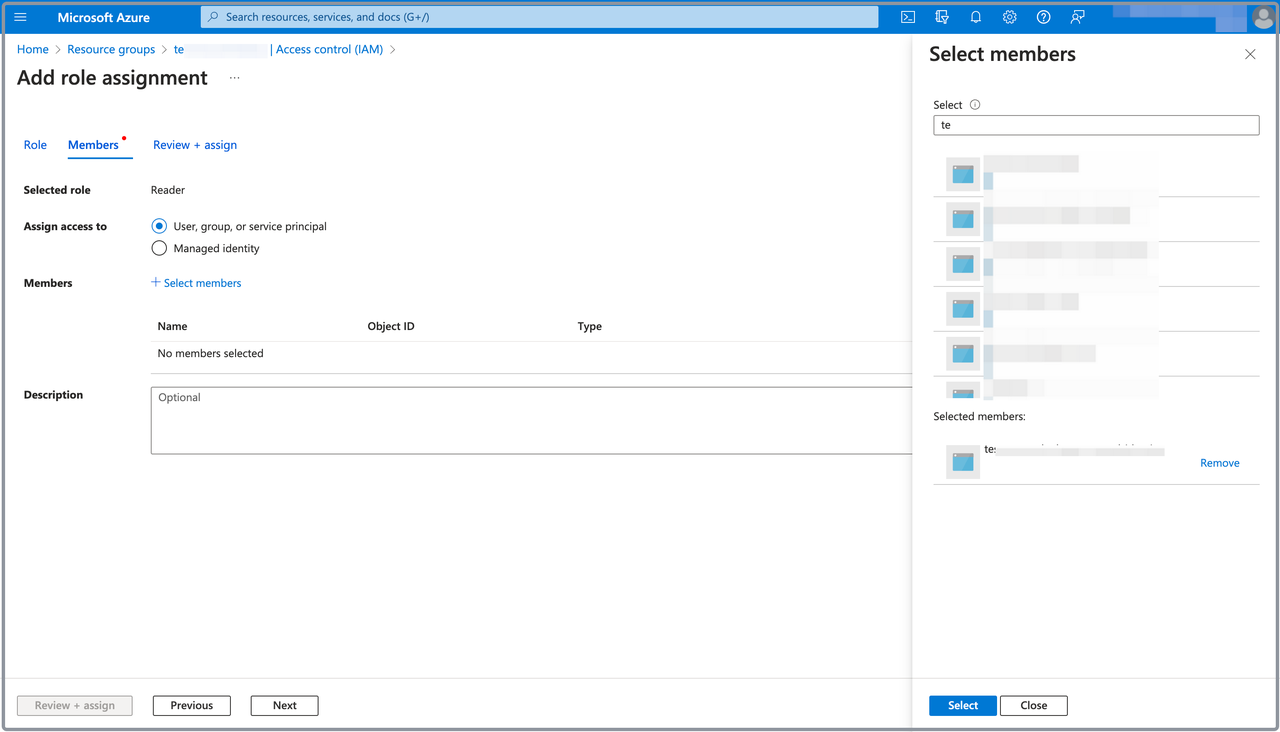 For Members, click Select members. In the right-side pane that appears, search for and select the application you registered in Step 1, and click Select.