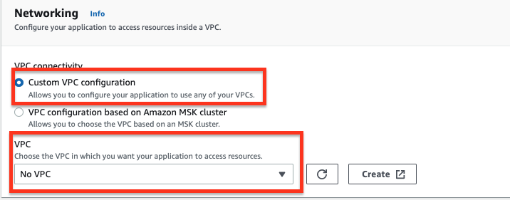 • オプション 1: VPC connectivity に対して Custom VPC configuration を選択し、VPC ドロップダウンリストから No VPC を選択します。 kinesis7