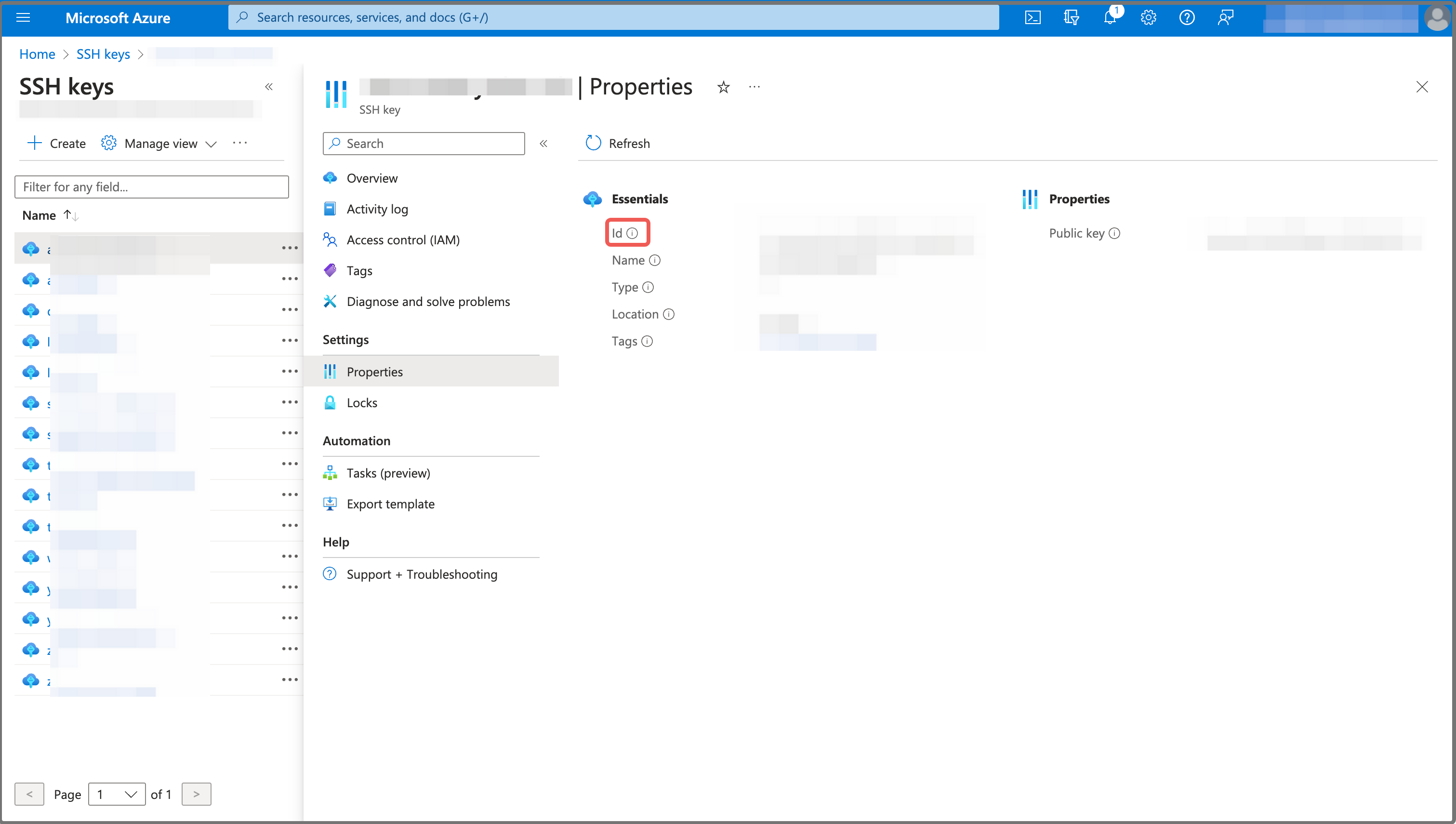 CelerData クラスターのデプロイメント用の SSH Key resource ID を取得するには、SSH keys サービスページに移動し、作成した SSH キーペアをクリックし、左側のペインで Properties を選択し、Id フィールドの横にある Copy ボタンをクリックして保存します。
