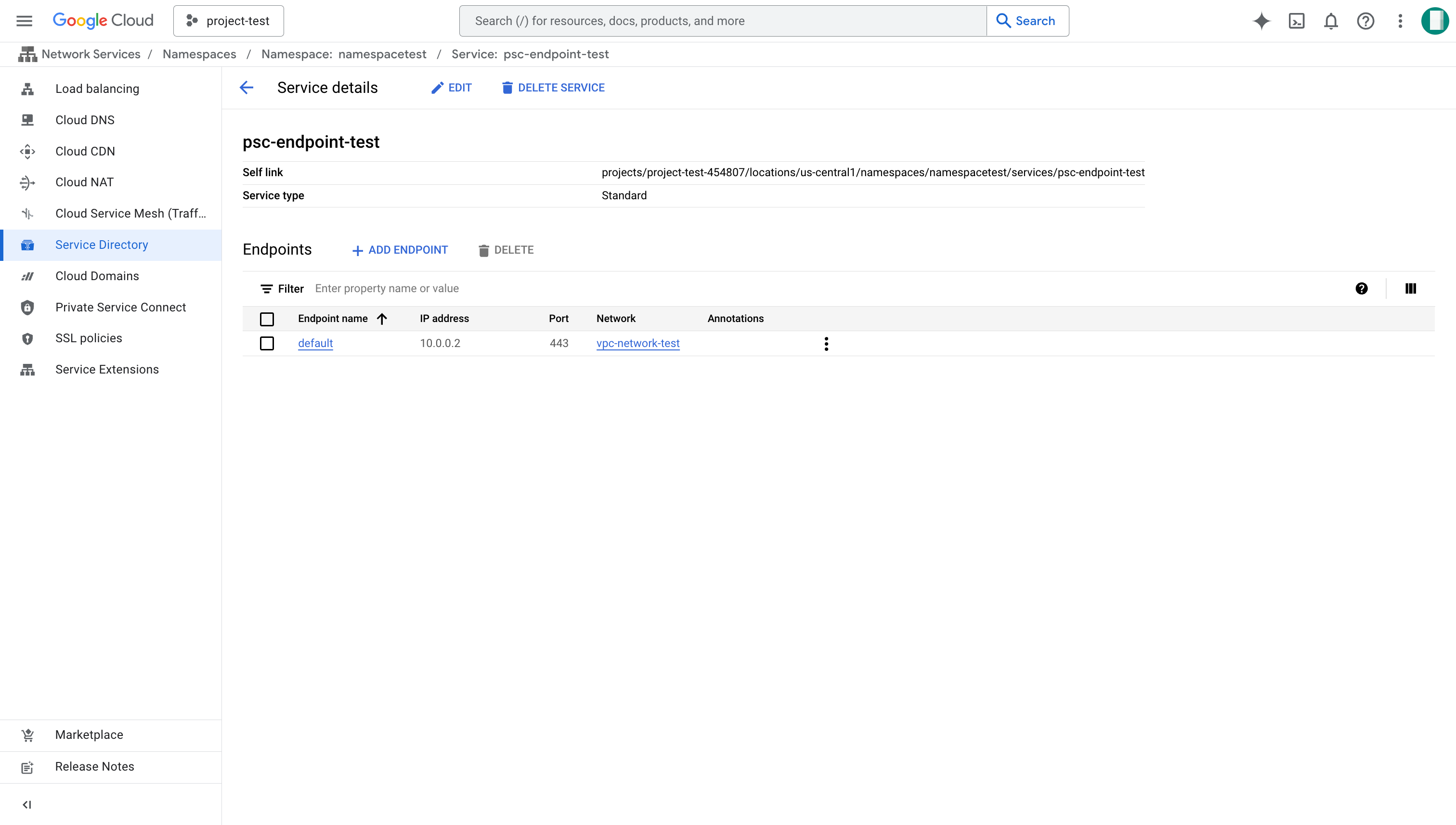 PSC エンドポイントを作成した後、GCP は自動的に サービスディレクトリ エントリと Cloud DNS ゾーンを生成します。これらを確認して、適切に設定されていることを確認します。