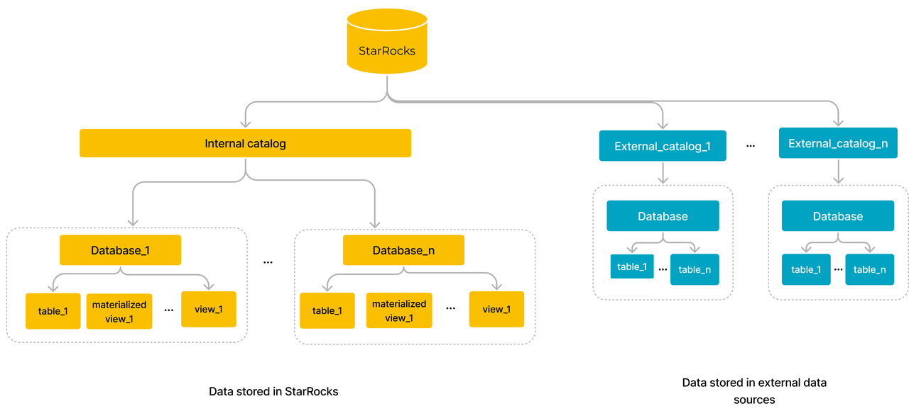 StarRocks は内部カタログを使用して内部データを管理し、外部カタログを使用してデータレイク内の外部データにアクセスします。StarRocks に保存されたデータは、1 つ以上のデータベースで構成される内部カタログ内で管理されます。データベースは、データを保存、管理、操作するために、テーブル、マテリアライズドビュー、ビューなどのさまざまなオブジェクトを管理します。StarRocks は、オブジェクトに対する操作を行うユーザーの権限を制御する権限システムを採用しており、データセキュリティを強化します。