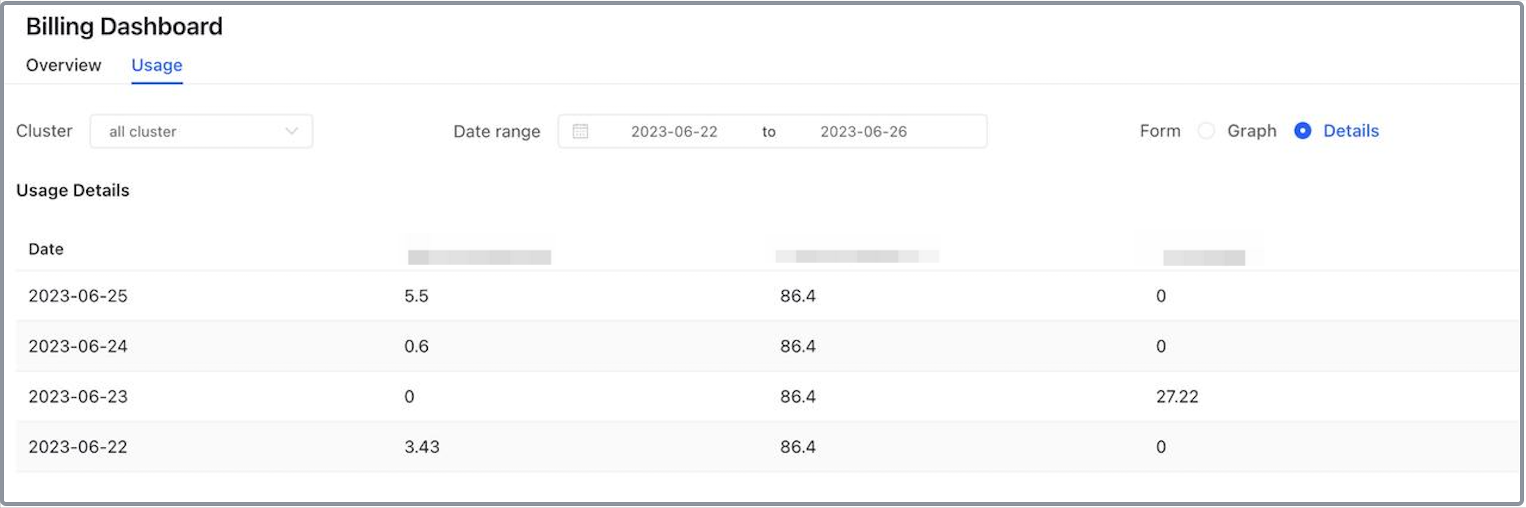 3. Billing Dashboard ページの Usage タブで、アカウントの次の使用情報を表示します: